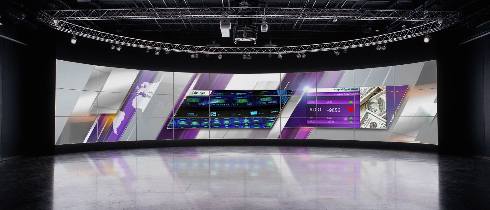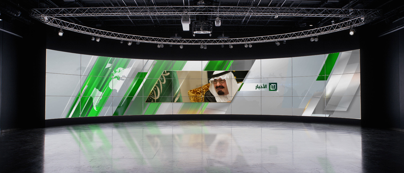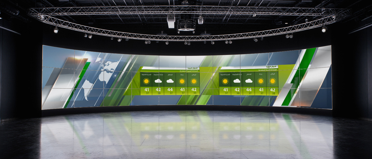 Challenge: Develop a consistent, adaptable video wall graphics system for Saudi TV, designed to integrate seamlessly with the network’s existing on-air design package. The system needed to accommodate multiple content segments — including news, sports, weather, business, and current affairs — while ensuring each category was visually distinct through a dedicated color scheme, all within a cohesive brand framework.