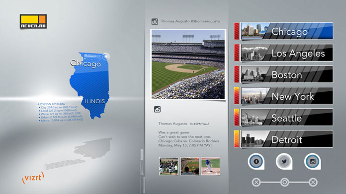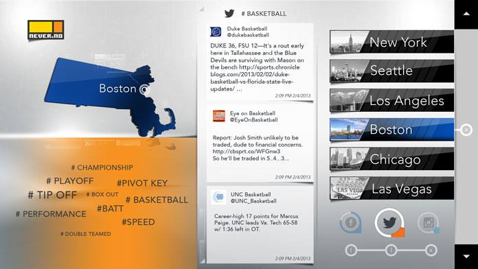 Challenge: Create an interactive, real-time screen experience for Never.no, capable of aggregating live social media content from Facebook, Twitter, and Instagram. The system needed to filter and display posts based on specific sports and targeted cities, providing audiences with a dynamic, localized snapshot of fan conversations and live reactions as they happened.