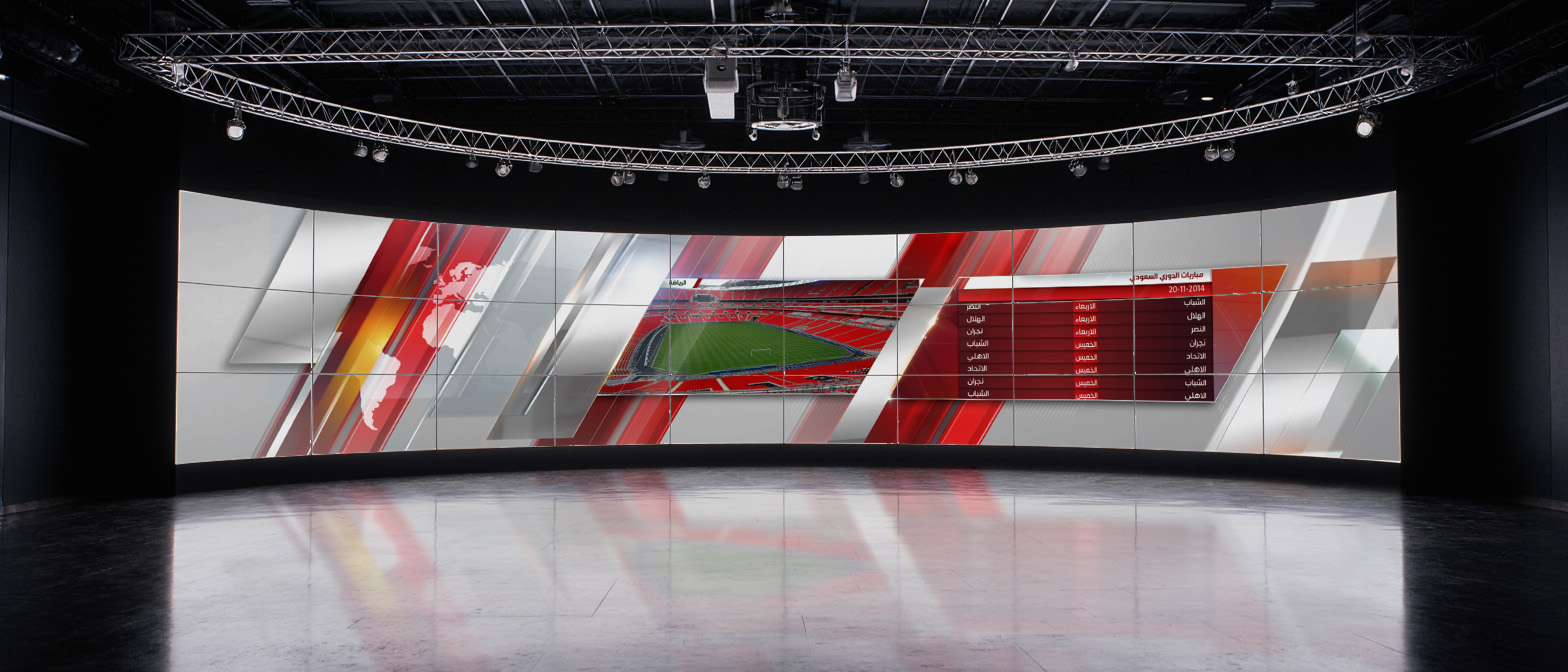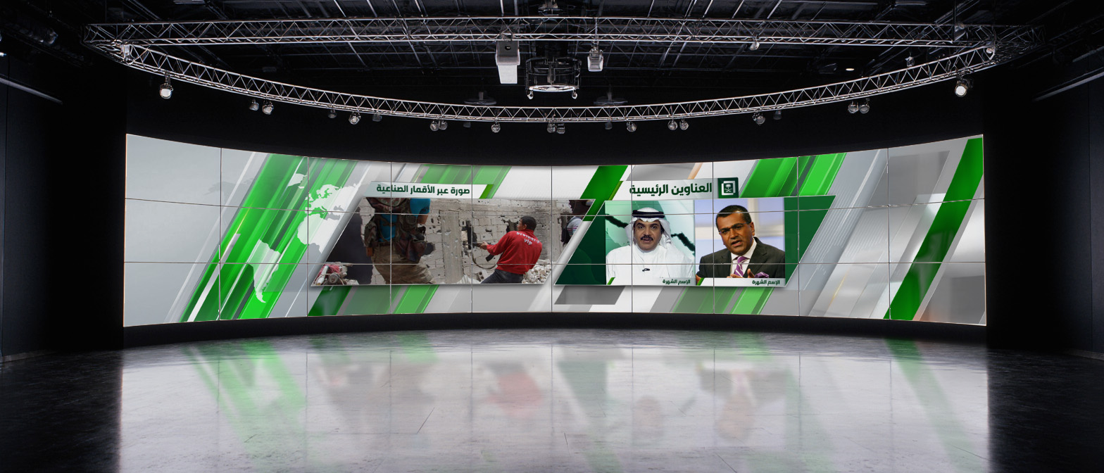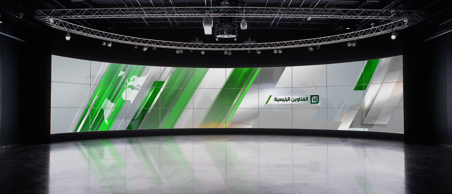 Challenge: Develop a consistent, adaptable video wall graphics system for Saudi TV, designed to integrate seamlessly with the network’s existing on-air design package. The system needed to accommodate multiple content segments — including news, sports, weather, business, and current affairs — while ensuring each category was visually distinct through a dedicated color scheme, all within a cohesive brand framework.