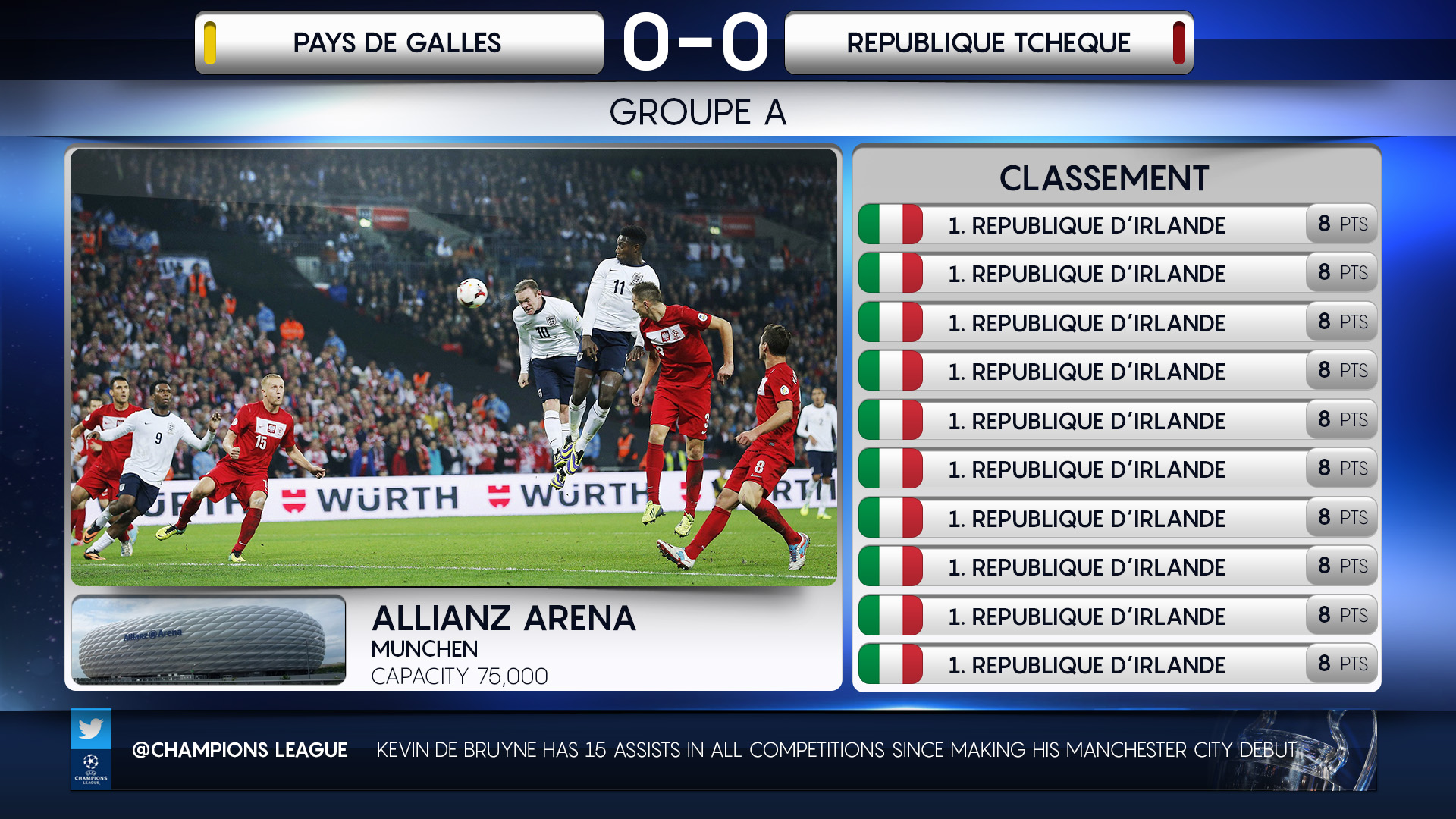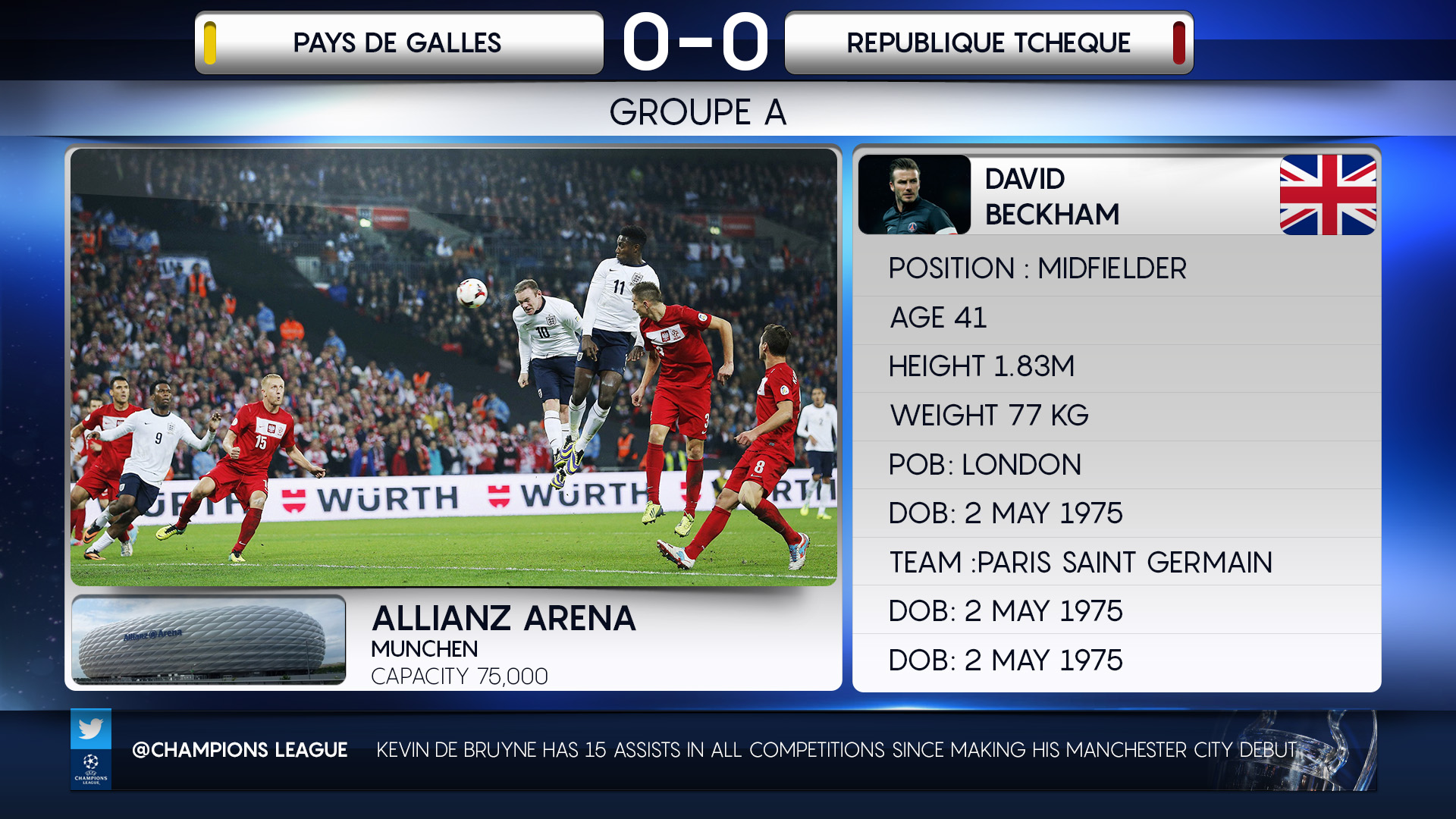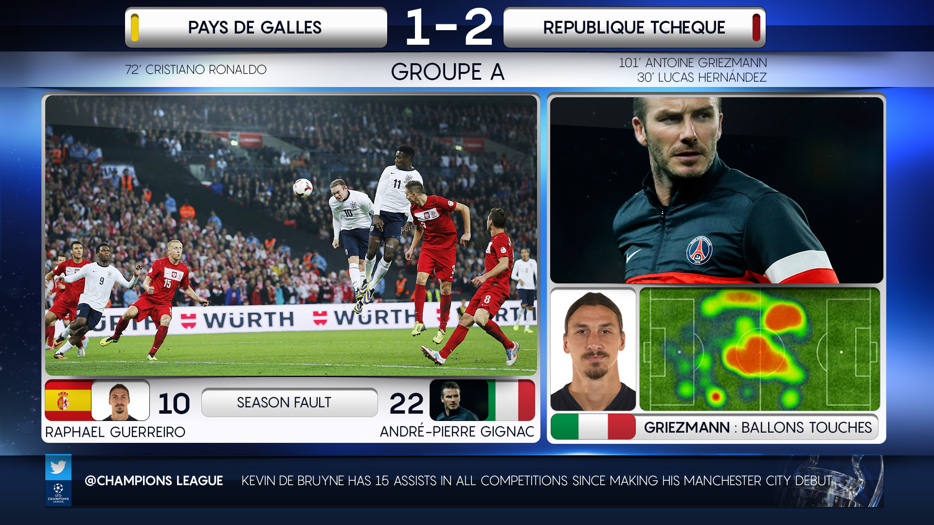 Challenge: Design a modular, multi-layered broadcast graphics system for beIN Sports’ UEFA Euro 2016 coverage, capable of integrating live video feeds alongside multiple real-time graphic elements. The objective was to enhance viewer engagement by incorporating live social media comments, stats, and match updates within a cohesive, dynamic on-screen layout, all while preserving clarity and brand consistency.